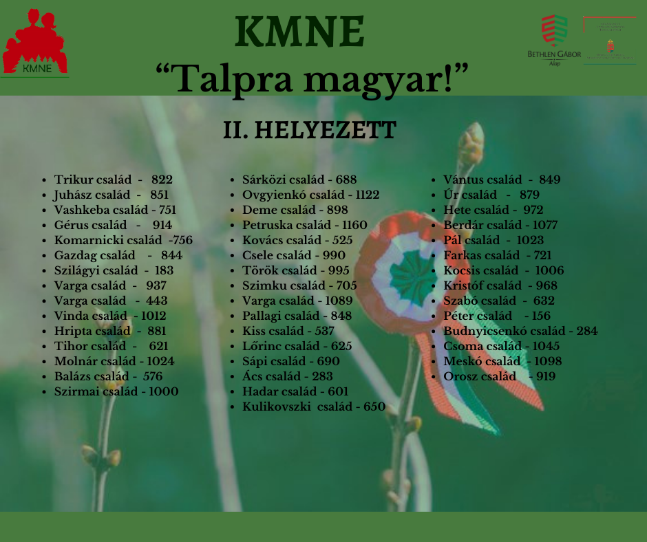 Az első helyezett ünnepélyes díjátadójára 2024. március 15-én 15:00 órától kerül sor a Beregszászi Pásztor Ferenc Közösségi és Zarándokházban.