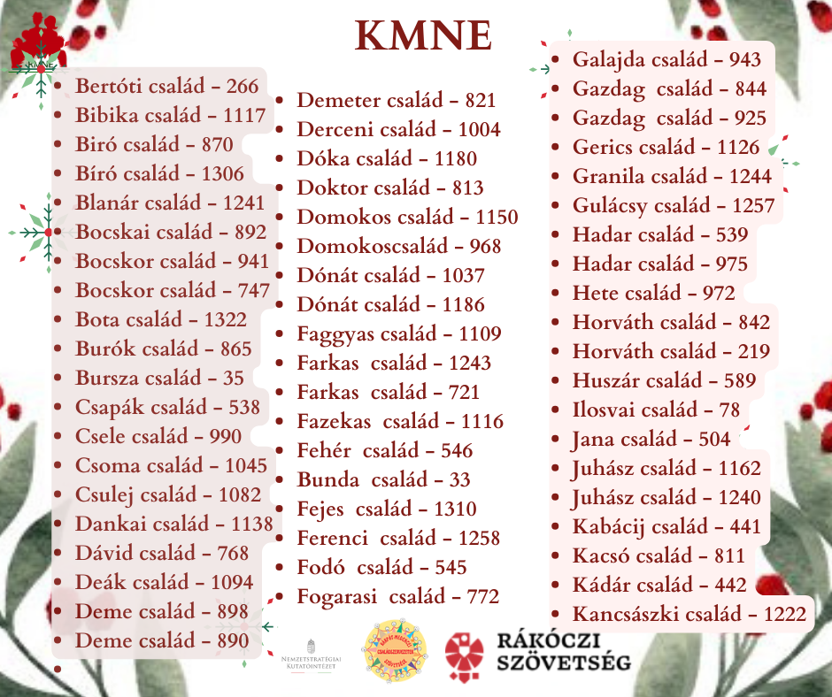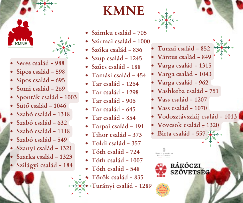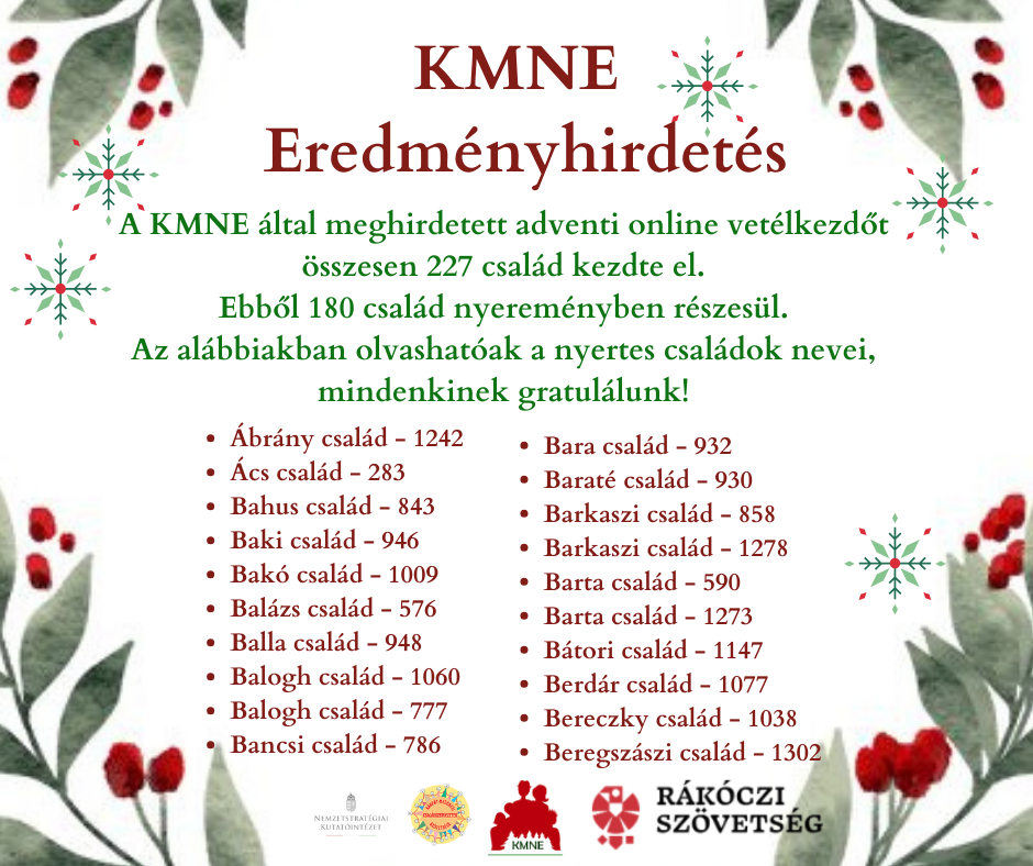 A Kárpátaljai Magyar Nagycsaládosok Egyesülete 2025-ben is meghirdette az adventi online vetélkedőt. A verseny három héten keresztül zajlott. Minden hétköznap a KMNE facebook oldalára került fel egy feladat, amelynek a megfejtését másnap délig kellett beküldeni. Összesen 227 család kezdte el a vetélkedőt, de csak azon családok részesülnek jutalomban, akik végig vitték a három héten keresztül tartó játékot. A nyertesek névsorát az alábbi képeken olvashatják.